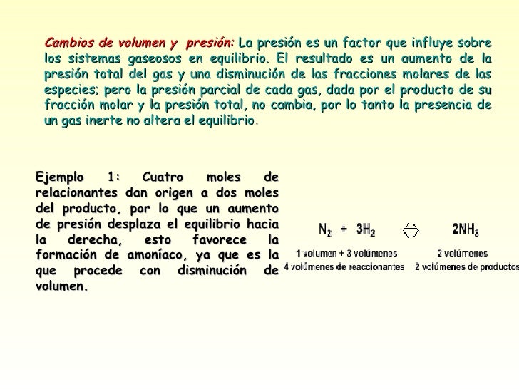 Cambios de volumen y presión: La presión es un factor que influye sobre los sistemas gaseosos en equilibrio. El resultado es un aumento de la presión total del gas y una disminución de las fracciones molares de las especies; pero la presión parcial de cada gas, dada por el producto de su fracción molar y la presión total, no cambia, por lo tanto la presencia de un gas inerte no altera el equilibrio . Ejemplo 1: Cuatro moles de relacionantes dan origen a dos moles del producto, por lo que un aumento de presión desplaza el equilibrio hacia la derecha, esto favorece la formación de amoníaco, ya que es la que procede con disminución de volumen.