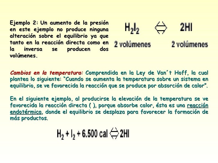 Por ejemplo, si se aumenta la concentración de uno de los reaccionantes, el equilibrio se desplaza hacia la derecha o hacia el lado de los productos.