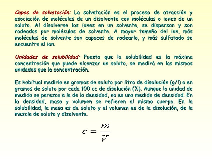 18. Capas de solvatación: La solvatación es el proceso de atracción y asociación de moléculas de un disolvente con moléculas o iones de un soluto. Al disolverse los iones en un solvente, se dispersan y son rodeados por moléculas de solvente. A mayor tamaño del ion, más moléculas de solvente son capaces de rodearlo, y más sulfatado se encuentra el ion. Unidades de solubilidad: Puesto que la solubilidad es la máxima concentración que puede alcanzar un soluto, se medirá en las mismas unidades que la concentración. Es habitual medirla en gramos de soluto por litro de disolución (g/l) o en gramos de soluto por cada 100 cc de disolución (%). Aunque la unidad de medida se parezca a la de la densidad, no es una medida de densidad. En la densidad, masa y volumen se refieren al mismo cuerpo. En la solubilidad, la masa es de soluto y el volumen es de la disolución, de la mezcla de soluto y disolvente.