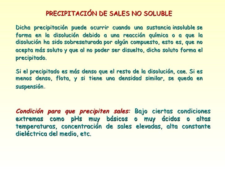 19. PRECIPITACIÓN DE SALES NO SOLUBLE Dicha precipitación puede ocurrir cuando una sustancia insoluble se forma en la disolución debido a una reacción química o a que la disolución ha sido sobresaturada por algún compuesto, esto es, que no acepta más soluto y que al no poder ser disuelto, dicho soluto forma el precipitado. Si el precipitado es más denso que el resto de la disolución, cae. Si es menos denso, flota, y si tiene una densidad similar, se queda en suspensión . Condición para que precipiten sales: Bajo ciertas condiciones extremas como pHs muy básicos o muy ácidos o altas temperaturas, concentración de sales elevadas, alta constante dieléctrica del medio, etc.